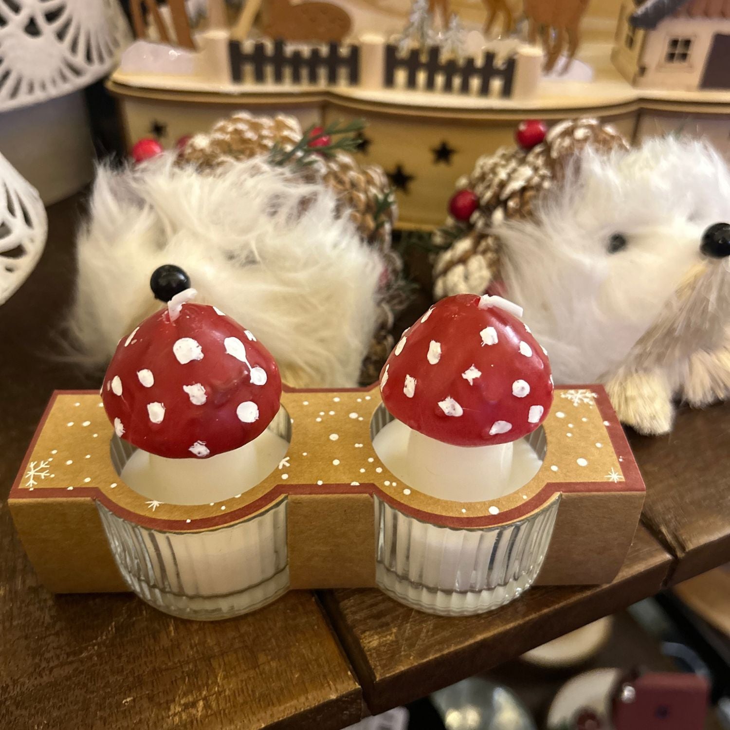 Set of Two Red and White Toadstool Candles in Glass Holders