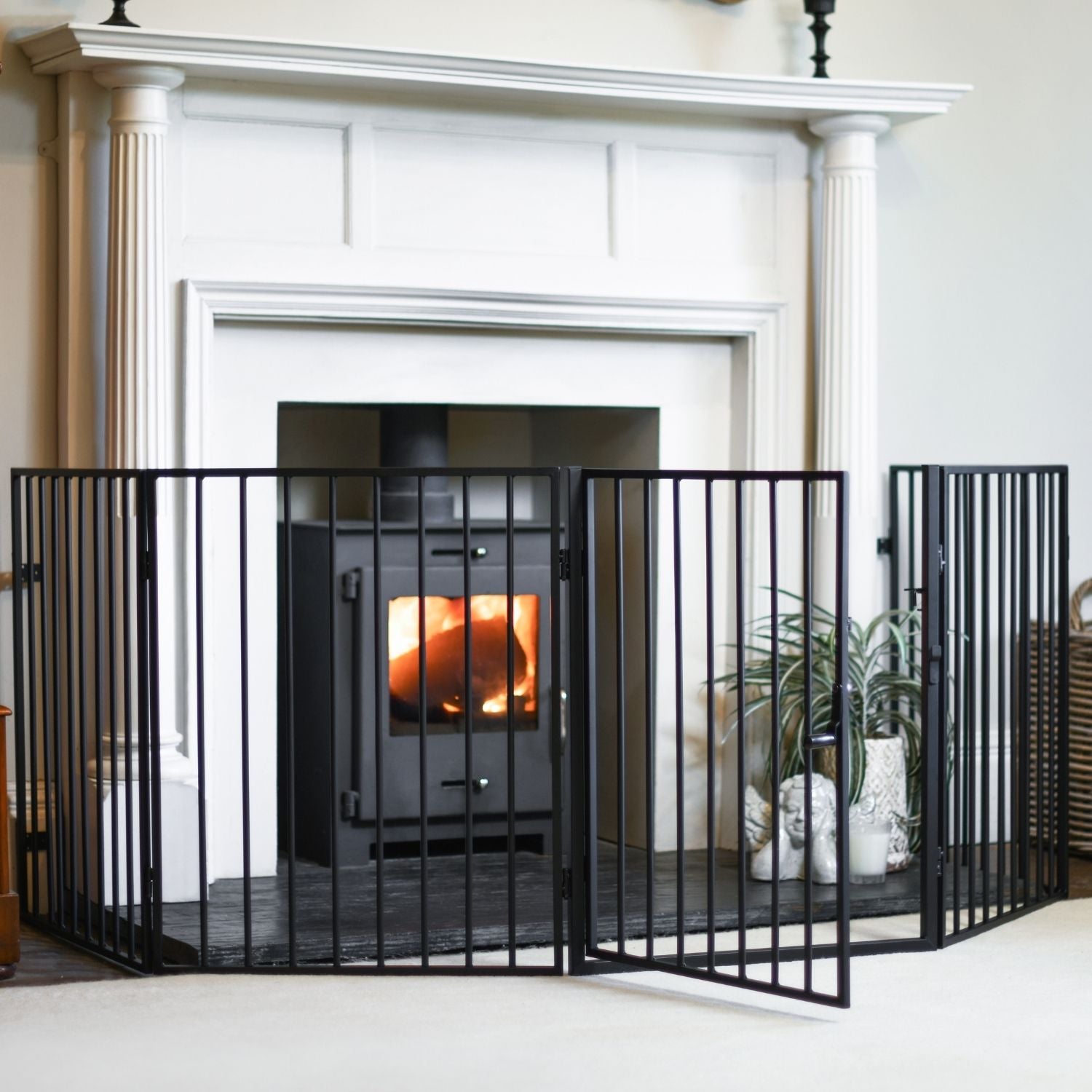 Protect your children and pets with our classic five-panel fire surround. This robust fire guard is crafted from high-quality, powder-coated steel in a versatile, timeless black. It features an opening door panel with a safety catch, allowing for easy fire tending while keeping young ones safe. The secure double locking gate allows it to be baby proof whilst allowing adults to easily open it quickly with one hand. It is easy to install and built to last.