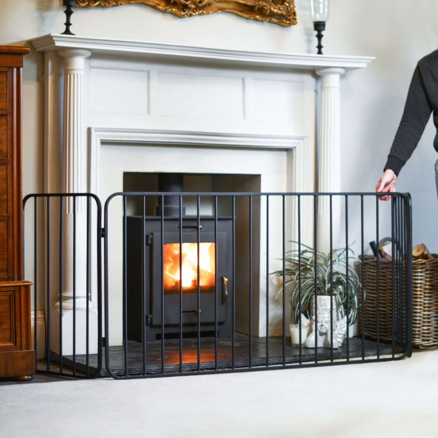Our fire surround is a sleek, secure, and understated three-fold fire guard designed to protect children and pets from an open fire or wood burner. Handcrafted from robust steel and finished in timeless black, its classic design will complement any fireplace. When the fire is not in use, this fire guard can be easily collapsed and stored away.